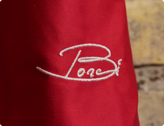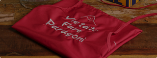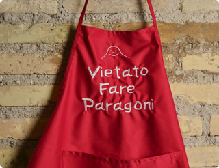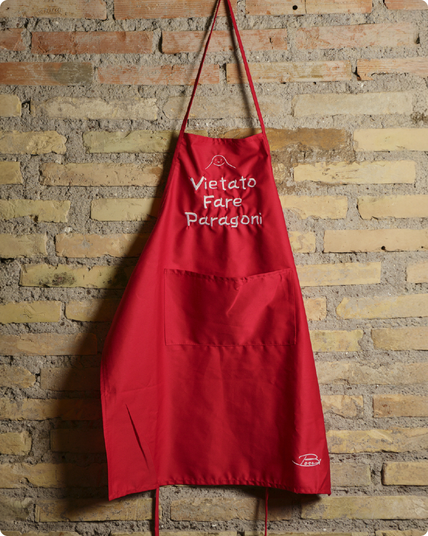 Rosso vivo, come la passione che si mette in cucina. Il grembiule “Vietato Fare Paragoni” è un omaggio allo stile inconfondibile di Gabriele Bonci: diretto, autentico e senza compromessi. Realizzato in tessuto resistente, è dotato di una capiente tasca frontale e di laccio regolabile. Sul petto campeggia la frase simbolo ricamata, accompagnata dal piccolo volto stilizzato che richiama lo spirito del brand. In basso, a chiudere il gesto, la firma originale di Bonci ricamata a contrasto: un dettaglio esclusivo che rende questo grembiule un vero pezzo da collezione. Perfetto per chi impasta, per chi sperimenta… e per chi sa che in cucina, proprio come nella vita, vietato fare paragoni.