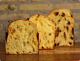 Farina di frumento tipo 00, burro, tuorlo d'uova, zucchero vanigliato, acqua, uvetta, pasta arancia, pasta madre, sale, miele millefiori, lievito naturale.